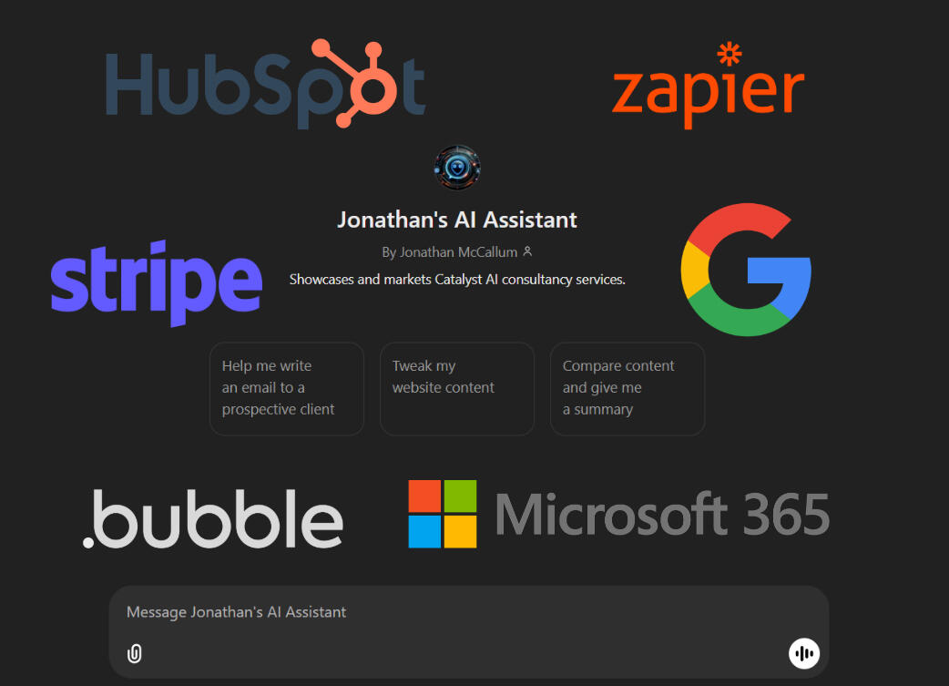 With Catalyst AI every employee can get their own custom AI ('GPT') to help them do more, faster & easier. Additionally, your company can have its own AI, capable of referring to your own company documents & answering employees' questions like "What's the annual leave policy?", even at 5am.